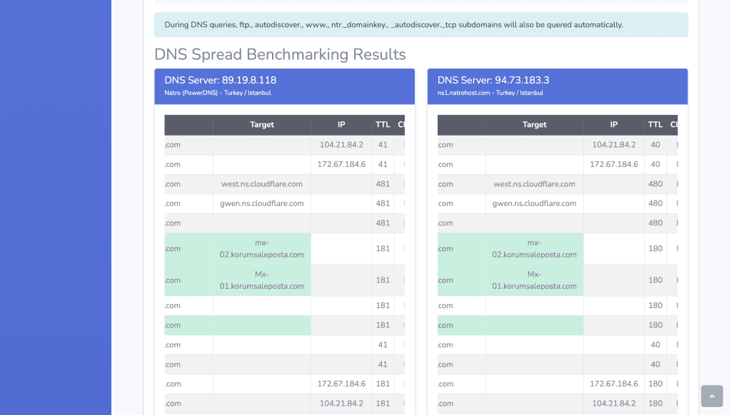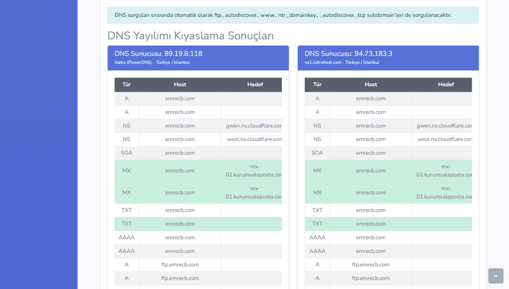 - DNS kayıtlarının (A, MX, TXT, CNAME) farklı sunuculardaki durumunu karşılaştırır