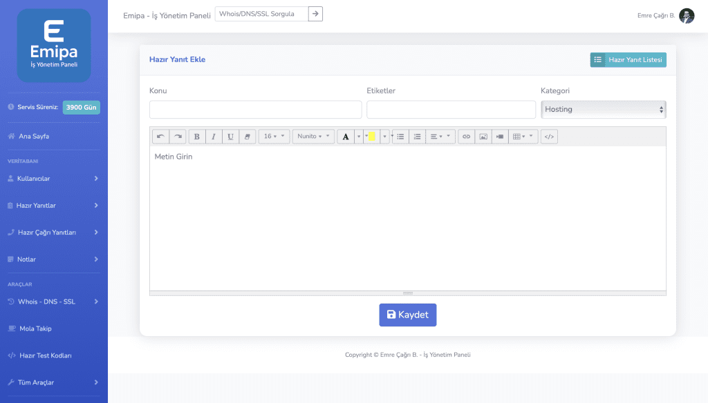 Emipa, hosting firmalarında görev yapan teknik destek personellerinin iş süreçlerini kolaylaştırmak için geliştirilmiş, yapay zeka entegreli kapsamlı bir paneldir. Panel; sorgulama, veri kaydı, mola takibi ve içerik yönetimini bir araya getirerek destek kalitesini artırmayı hedefler.