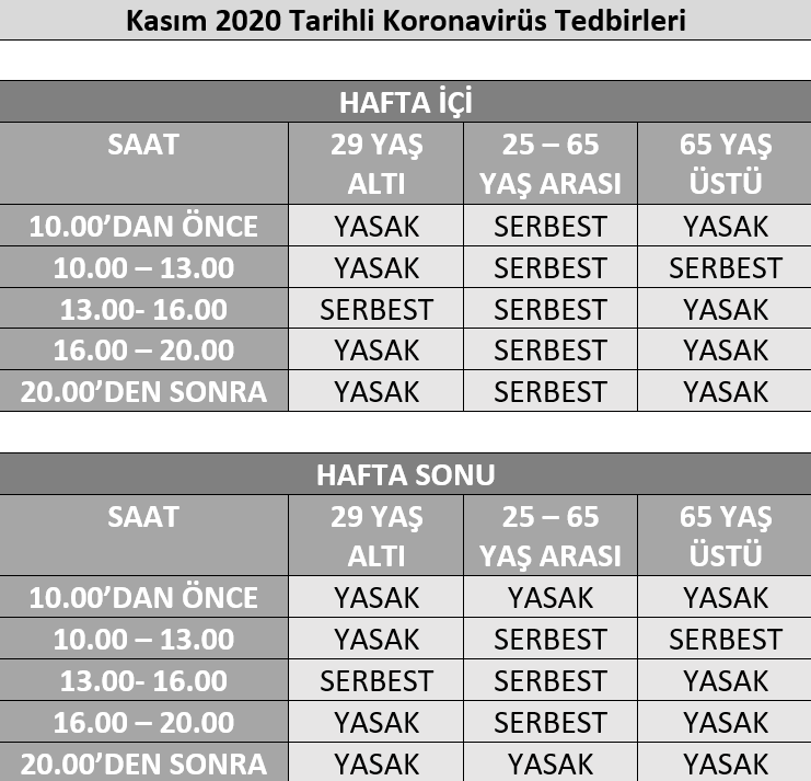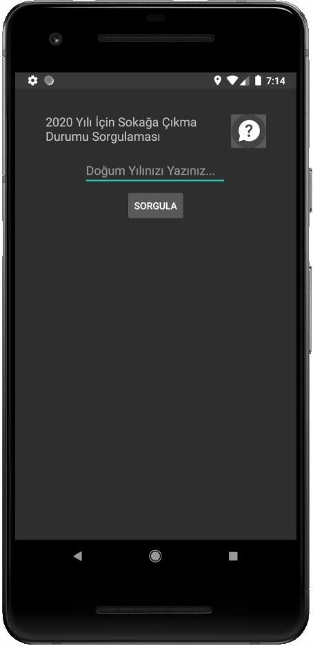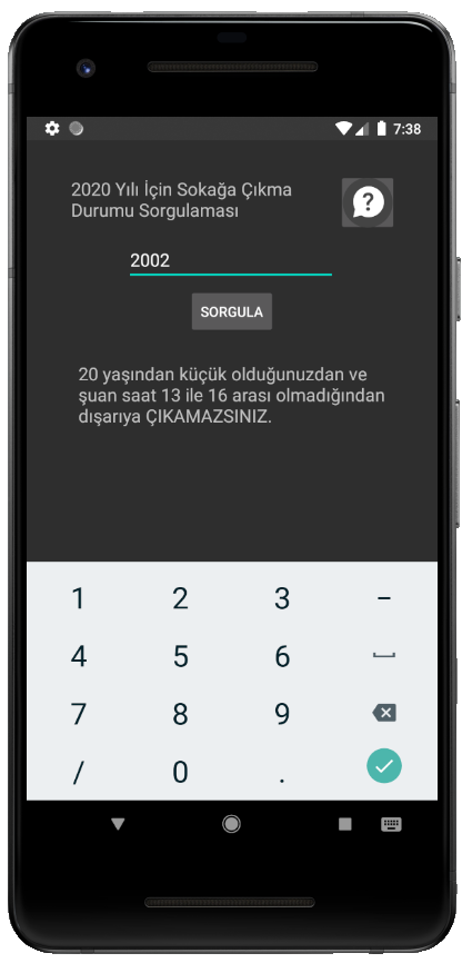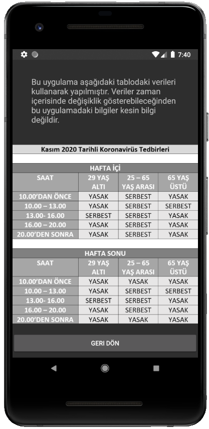 Java ile yazılan bu Android uygulamamda Kasım 2020 de alınan koronavirüs tedbirleri gereğince kullanıcıdan doğum yılı alınarak o an ne yapması gerektiğini ekrana yazdırttım. Uygulama aşağıdaki tabloya göre çalışmaktadır.
