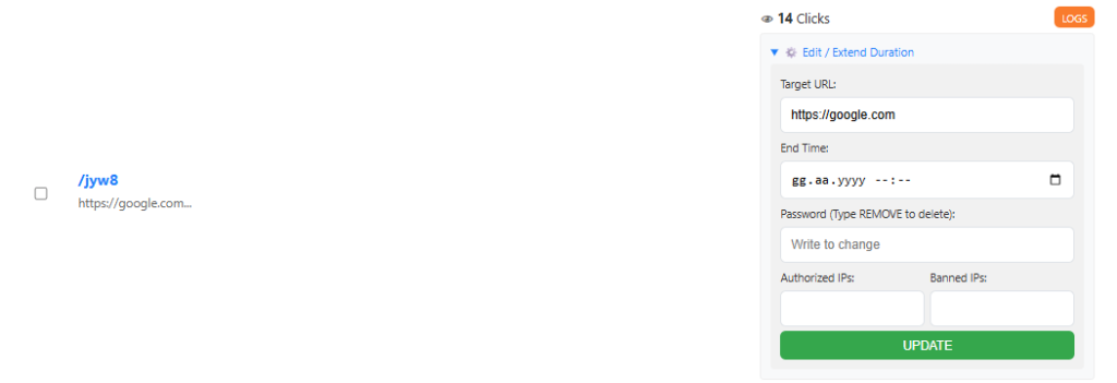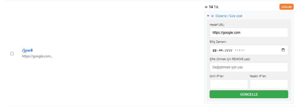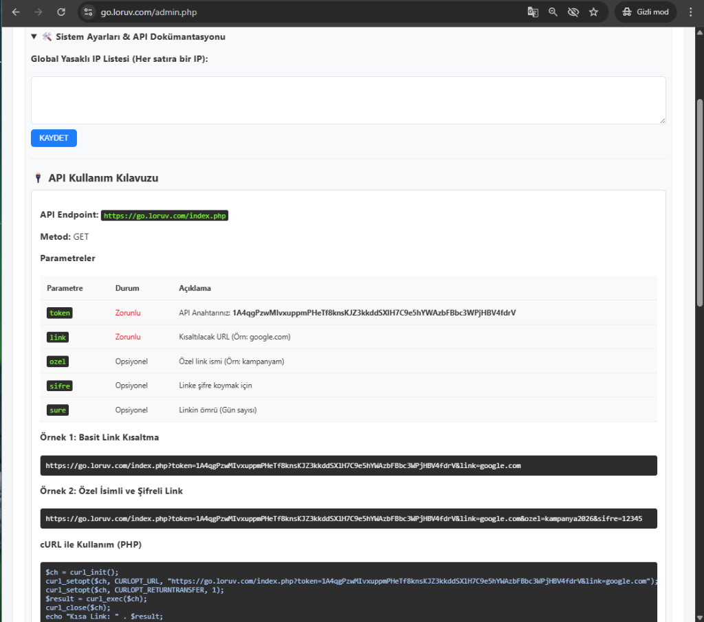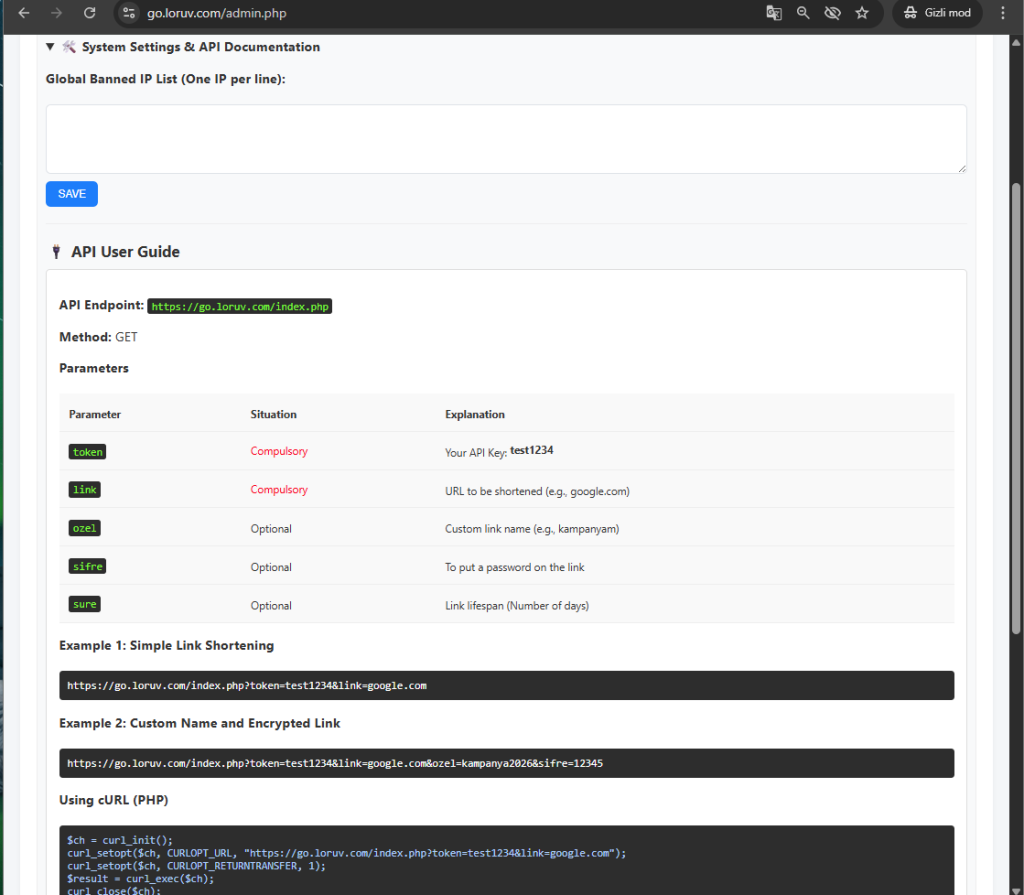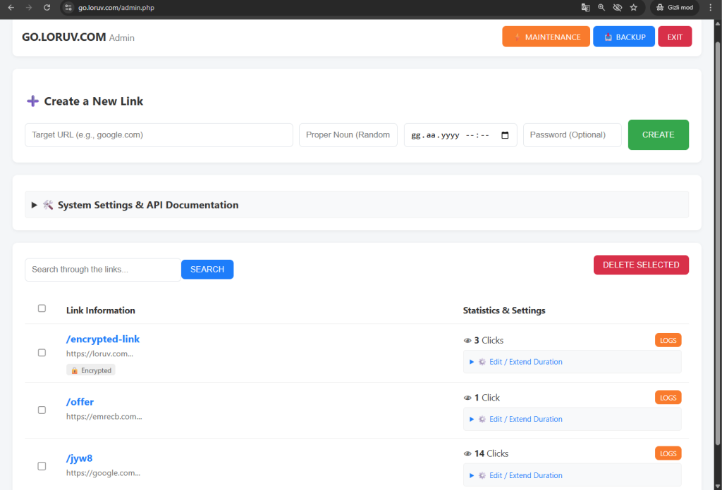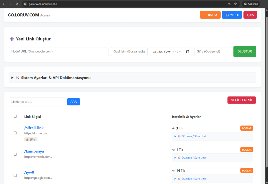 • Esnek Parametreler: API üzerinden özel link adı (slug), şifre, süre ve hedef URL tanımlama yeteneği.