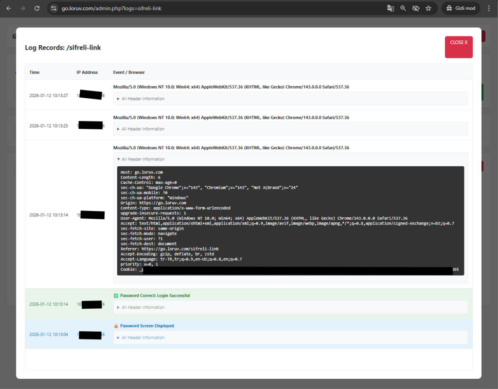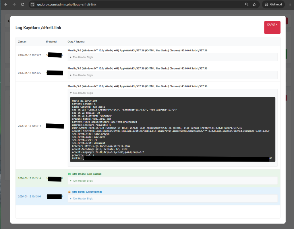 • Saldırı Tespiti: Şifreli linklere yapılan hatalı giriş denemeleri, saldırganın IP adresi, denediği şifre ve User-Agent bilgisiyle birlikte raporlanır.