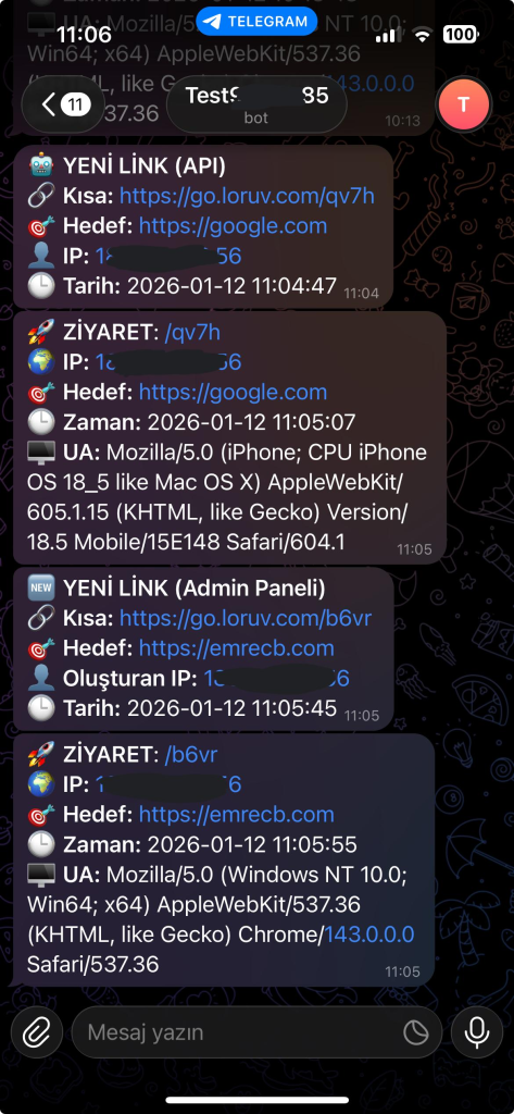 • Aktivite Logları: API veya Panel üzerinden oluşturulan yeni linkler ve başarılı girişler anlık bildirilir.