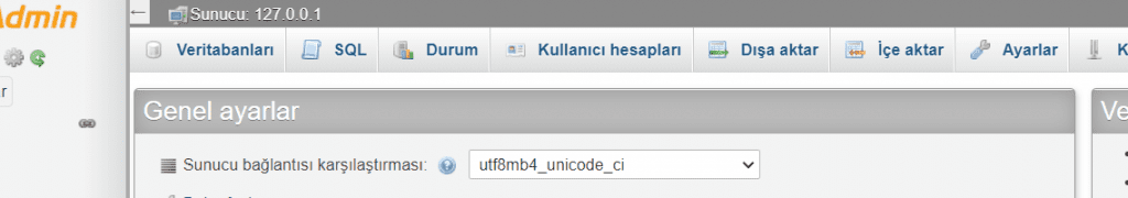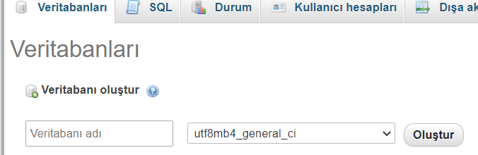 Önce yeni veritabanı oluşturalım. Yükleyeceğimiz sql dosyası hata vermemesi için oluştururken hiçbir ayara dokunmamak en iyi seçenek olacaktır.