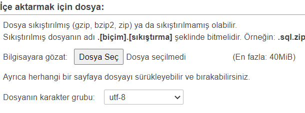 Aynı şekilde dosya seç’e basıp .sql uzantılı dosyamızı seçelim ve alttaki git butonuna basalım.